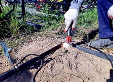 Приступив к работе, мы, первым делом, очистили могилу от травы. Затем положили по периметру места захоронения пятисантиметровую металлическую полосу, которая будет служить границей и дополнительной опорой брусчатке. Получившийся прямоугольник свариваем по углам.